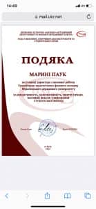 Окрім здійсненої освітньої діяльності, Мариною Паук, як заступником директора з навчально-виховної роботи, забезпечено навчання та виховання студентської молоді, враховуючи у діяльності Європейську мережу національних центрів інформації про академічну мобільність і визнання, співпрацю з організаціями-партнерами та професорсько-викладацьким колективом ДВНЗ «УжНУ», МДУ, роботодавцями: