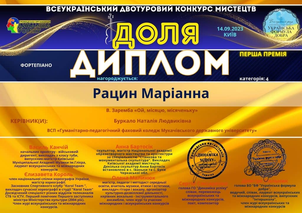 14 вересня 2023 року відбувся Всеукраїнський двотуровий конкурс мистецтв «ДОЛЯ» м. Київ, на якому здобувачка освіти ІV курсу музичного відділення ВСП «ГПФК МДУ» Рацин Маріанна вибороли почесну нагороду – Дипломом Лауреата І премії в номінації інструментальний жанр фортепіано!