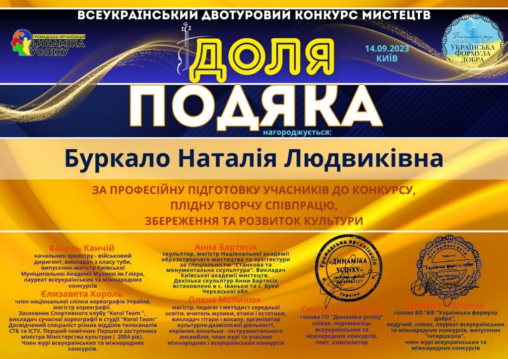 Подяку від організаторів та журі Всеукраїнського конкурсу мистецтв за професійну підготовку учасниці до конкурсу, плідну творчу співпрацю, збереження та розвиток культури України отримала викладач Буркало Наталія Людвиківна.