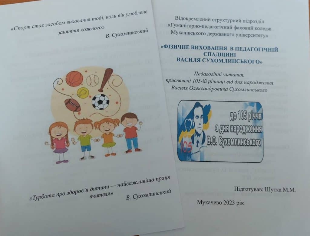 Сьогодні викладачем фізичної культури Шутка М.М. з нагоди 105-ї річниці від Дня народження В.О. Сухомлинського було проведено педагогічні читання «Фізичне виховання в педагогічній спадщині В.О. Сухомлинського» де були присутні викладачі коледжу та здобувачі освіти ІІ курсів шкільного відділення.