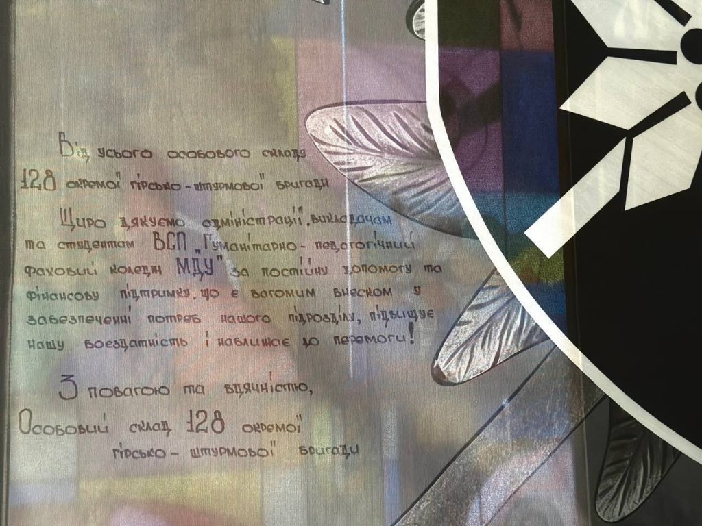 Днями, ВСП «ГПФК МДУ» отримав прапор 128-ї окремої гірсько-штурмової бригади з подякою від усього її особового складу адміністрації, викладачам, студентам закладу освіти за постійну допомогу та фінансову підтримку, що є вагомим внеском у забезпеченні потреб підрозділу, підвищення його боєздатності та наближення до перемоги!