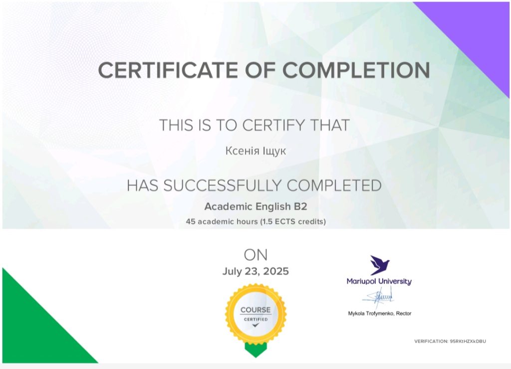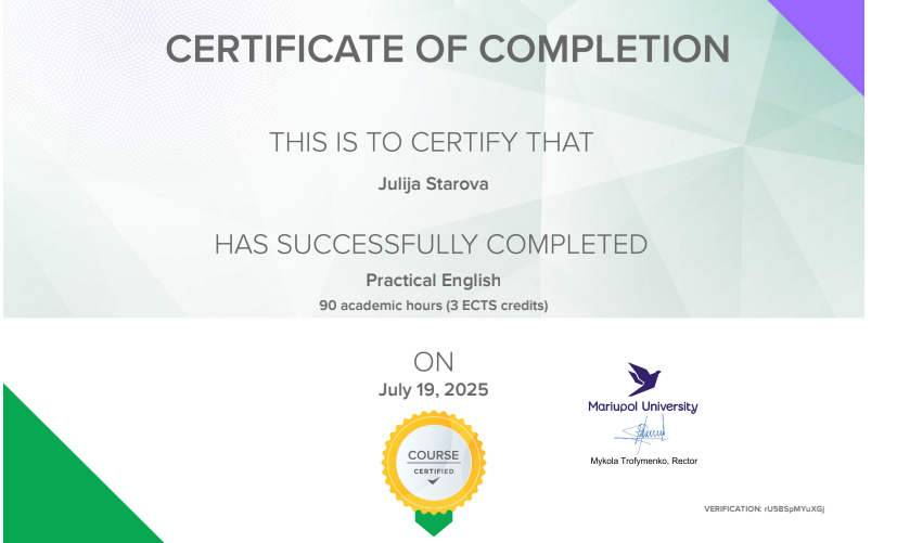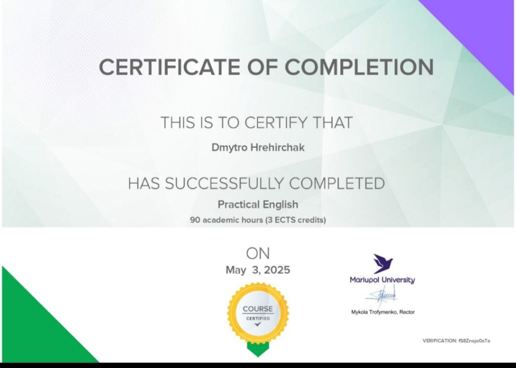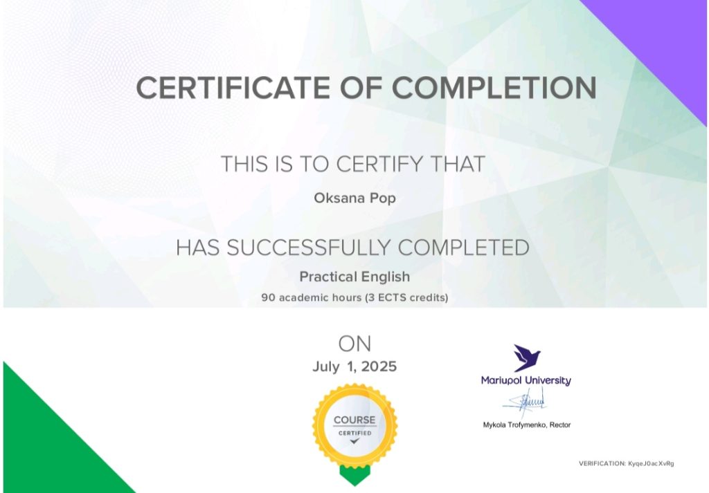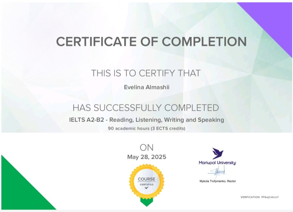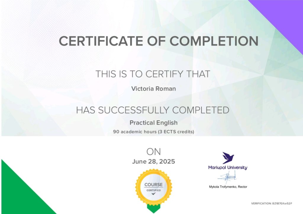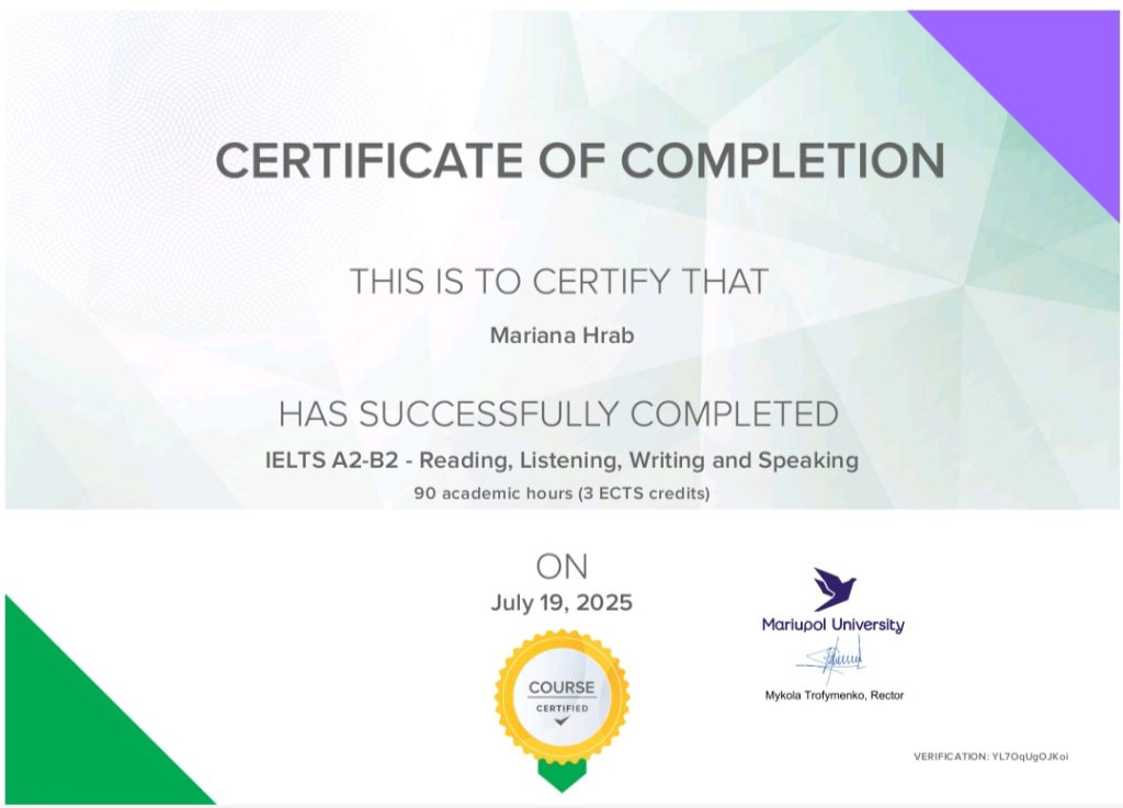 Учасники курсів продемонстрували високий рівень відповідальності та мотивації, сумлінно опановуючи матеріал різних рівнів складності — від базового до професійно спрямованого. Після завершення навчання та успішного складання підсумкового тестування учасники отримали сертифікати, які підтверджують сформовані мовні навички та обсяг виконаної роботи. Сертифікати про успішне завершення курсів отримали викладачі коледжу Алмашій Е. В., Граб М. В., Грегірчак Д. Б., Іщук К. П., Старова Ю. В., Фийса Н. В. та здобувачі освіти Тетерюк А. В. (3-Б), Роман В. В. (4-Г), Поп О. В. (4-Б).