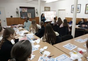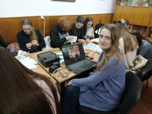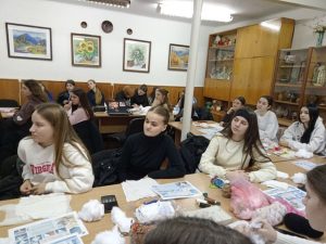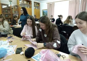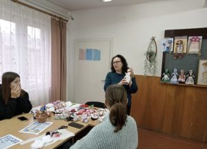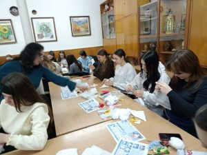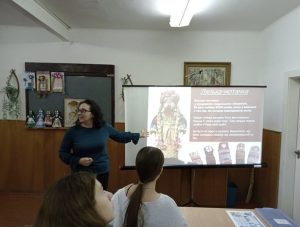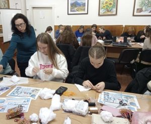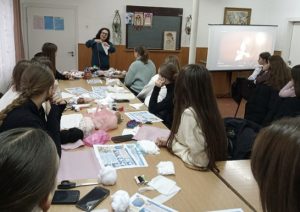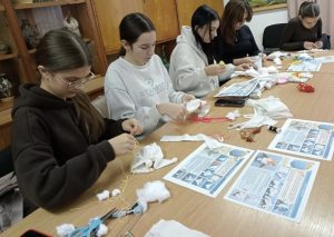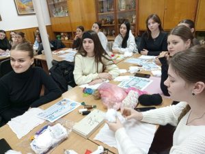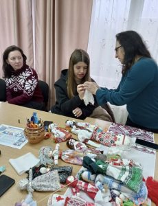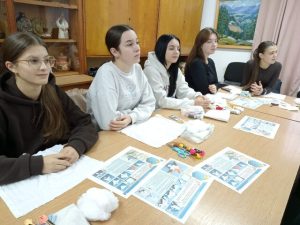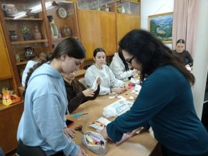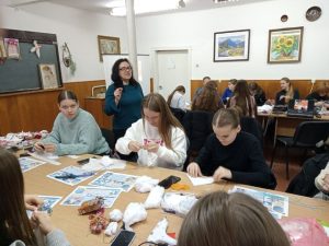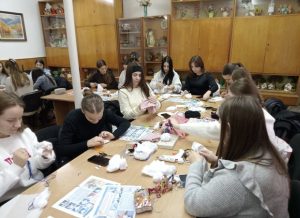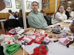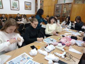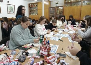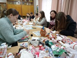 Під час заняття викладачка представила змістовну презентацію про історичні витоки української мотанки, її роль у культурі та побуті, обрядові функції та виховний потенціал. Здобувачі освіти дізналися про зв’язок народної іграшки з національною свідомістю та традиціями українського народу, про різновиди ляльок та матеріали, які використовують у їх створенні — відповідно до розділу програми, що розкриває загальні відомості про народну іграшку й ляльку-оберіг. Викладачка наголосила, що мотанка — це не лише лялька в класичному розумінні, а й птахи, тварини, обереги для дому, символічні фігурки, які українці створювали для захисту, побажання добра та збереження родинного тепла.