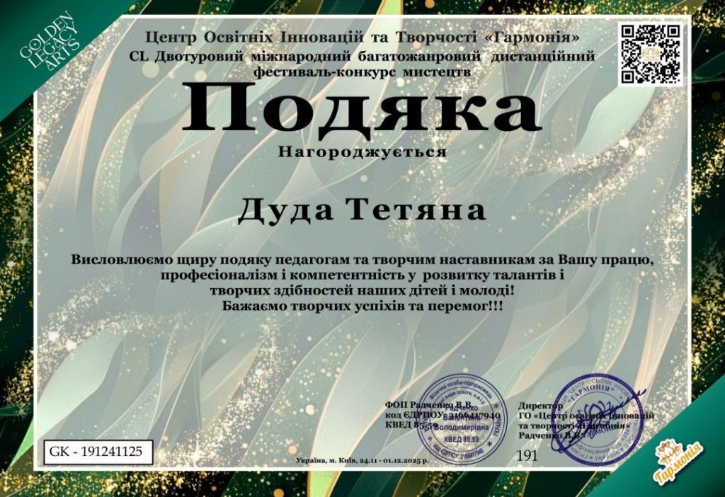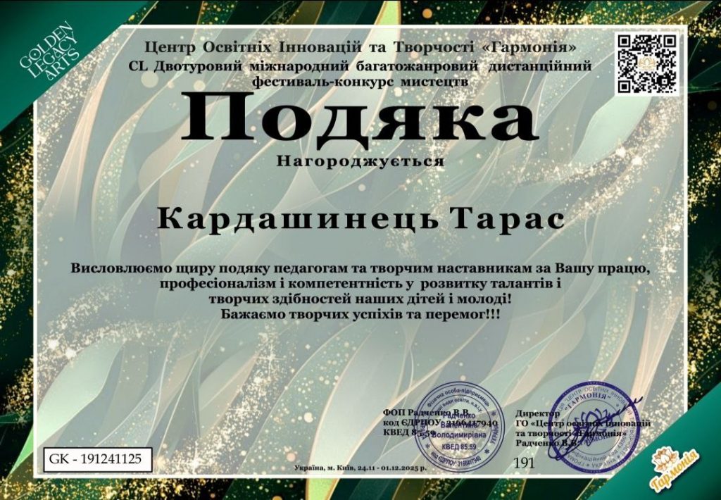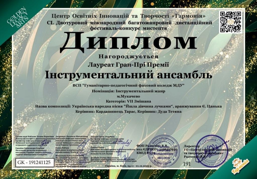 Вітаємо  учасників  інструментального ансамблю музичного відділення під керівництвом Тараса Кардашинця та Тетяни Дуди з перемогою на  “CL Двотуровому міжнародному багатожанровому фестивалі конкурсі  мистецтв” ( Київ, 24.11-01.12 2025 р.), колектив нагороджений   дипломом  лауреата Гран-Прі.