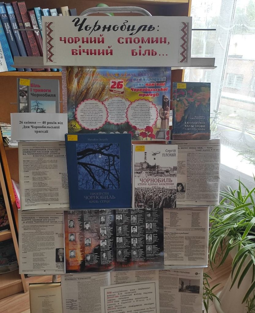 До річниці трагедії в читальній залі бібліотеки ВСП «ГПФК МДУ» організовано книжкову виставку «Чорнобиль: чорний спомин, вічний біль…», де представлено: