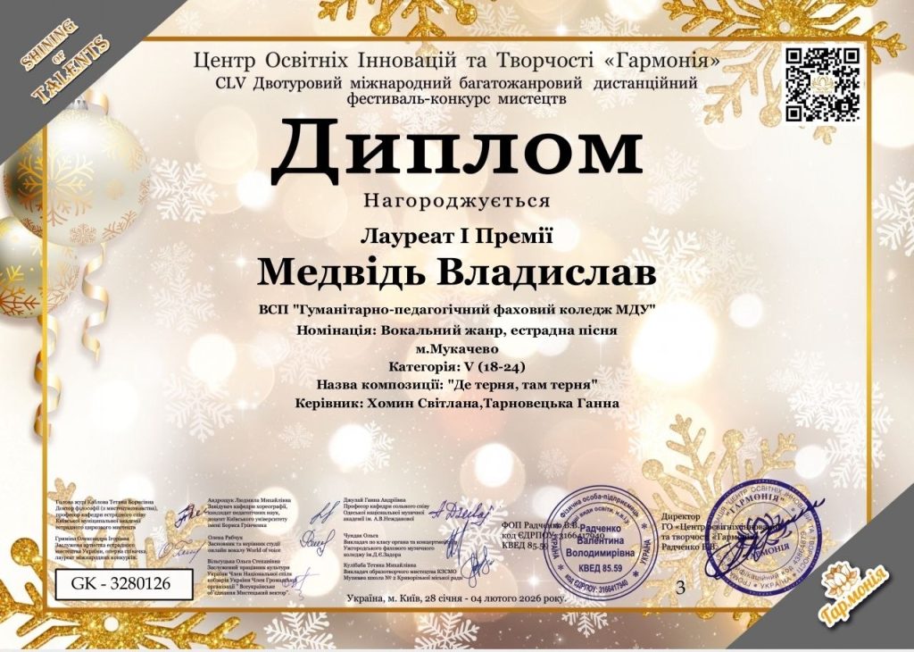 Вітаємо здобувача освіти 3-в курсу музичного відділення Медвідя Владислава – Лауреата I Премії Двотурового міжнародного багатожанрового дистанційного фестивалю-конкурсу мистецтв “Shining of Talents” (м. Київ) в номінації вокальний жанр, естрадна пісня.