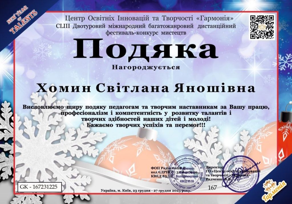 Висловлюємо подяку за підготовку здобувача освіти до участі в конкурсі викладачу постановки голосу Хомин С. Я., концертмейстеру Тарновецькій Г.Я.