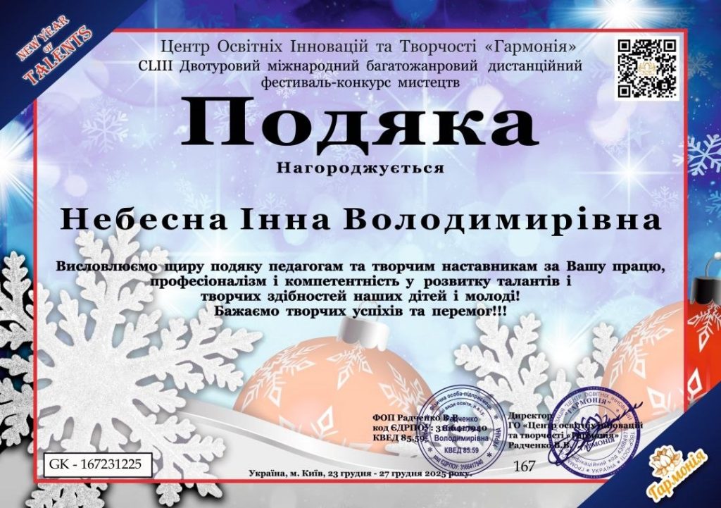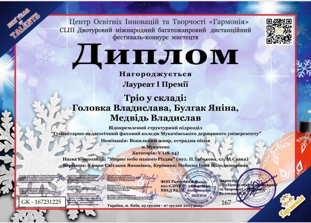 Вокальне тріо здобувачів освіти 3 в курсу у складі: Головки Владислави, Булгак Яніни та Медвідя Владислава стали переможцями Міжнародного багатожанрового дистанційного фестивалю-конкурсу “NEW YEAR OF TALENTS” – Лауреатами І Премії.